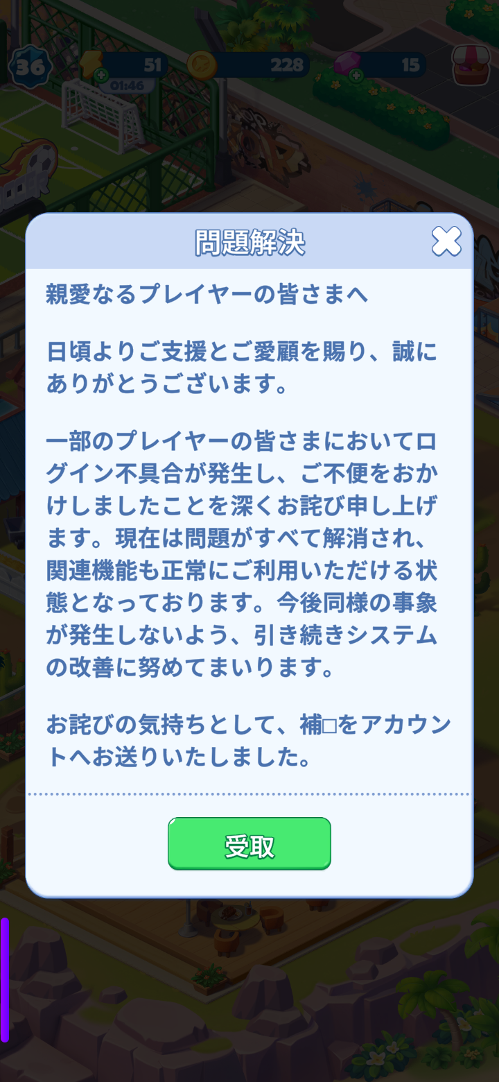 全く期待してなかったが、なんとプレイヤーに補填のアイテムが配られた。