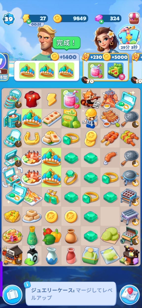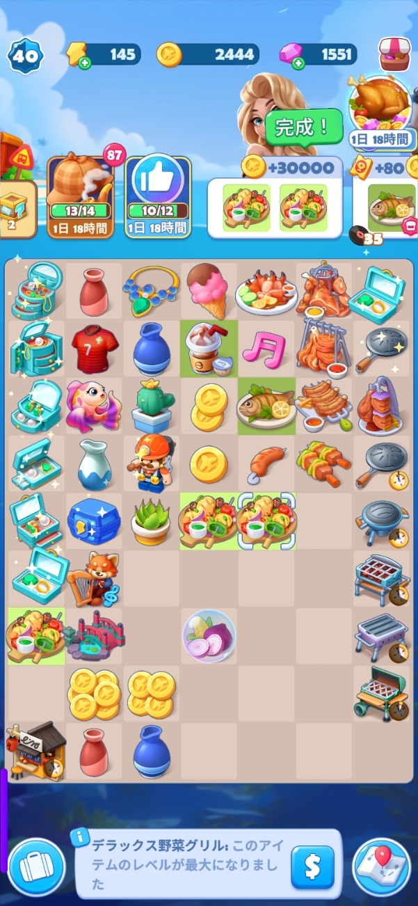 ・コインがなくてレベル35~36でしばらく止まってしまった。その後、グリルを優先して商品を完成させたらコインが大量に手に入って一気に進んだ。
