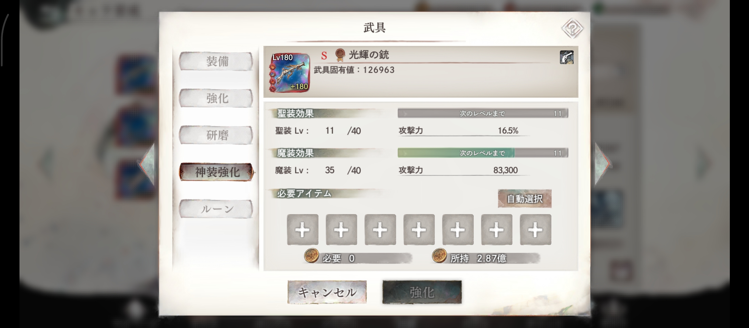 神装強化というものがあることに気づいてやってみたんだけど、いまいち理解できていない。