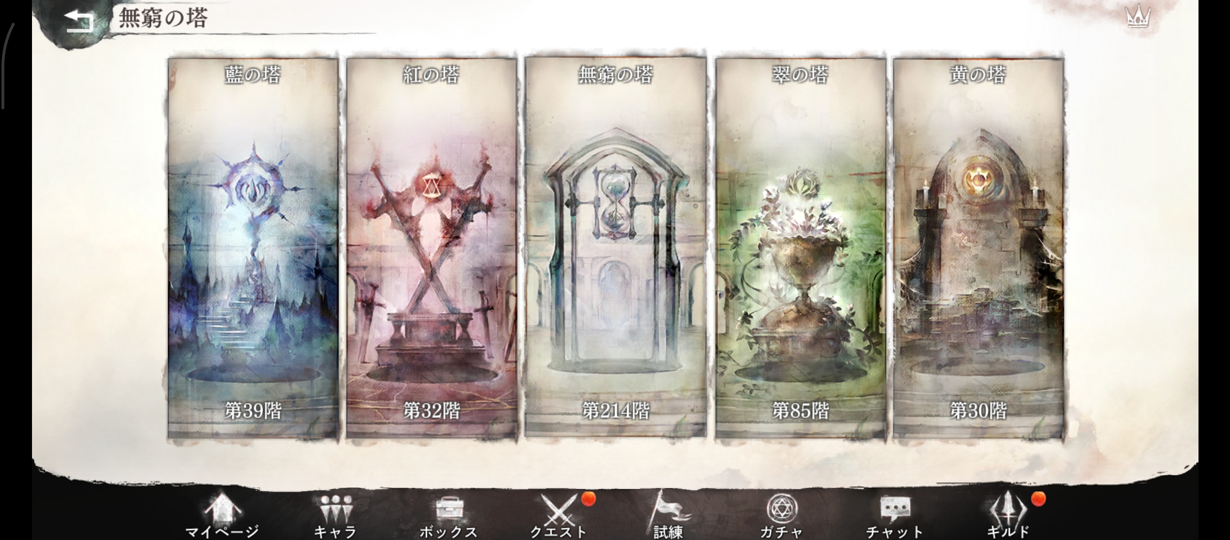 ・試練→「無窮の塔」はクリアすると強い装備がもらえるので、勝てるところまで常にクリアしていきたい。