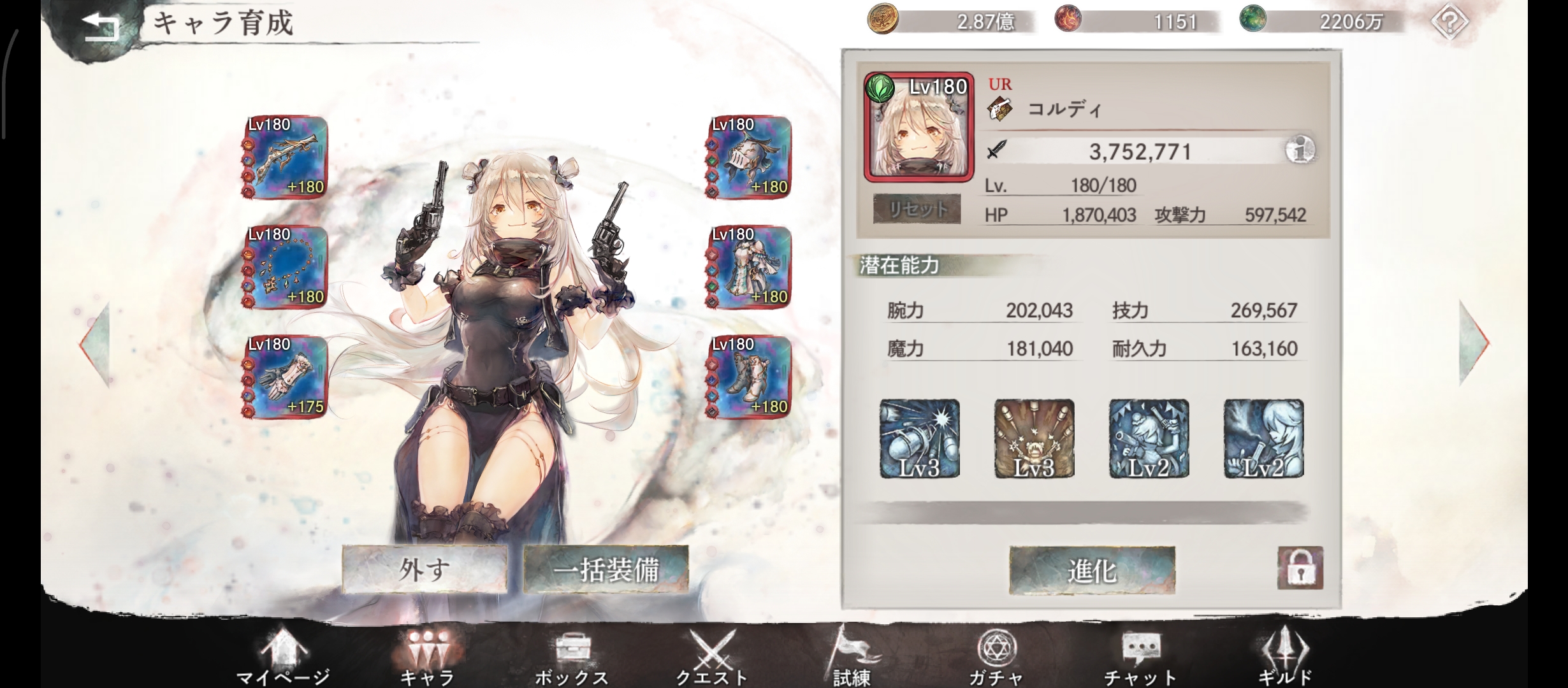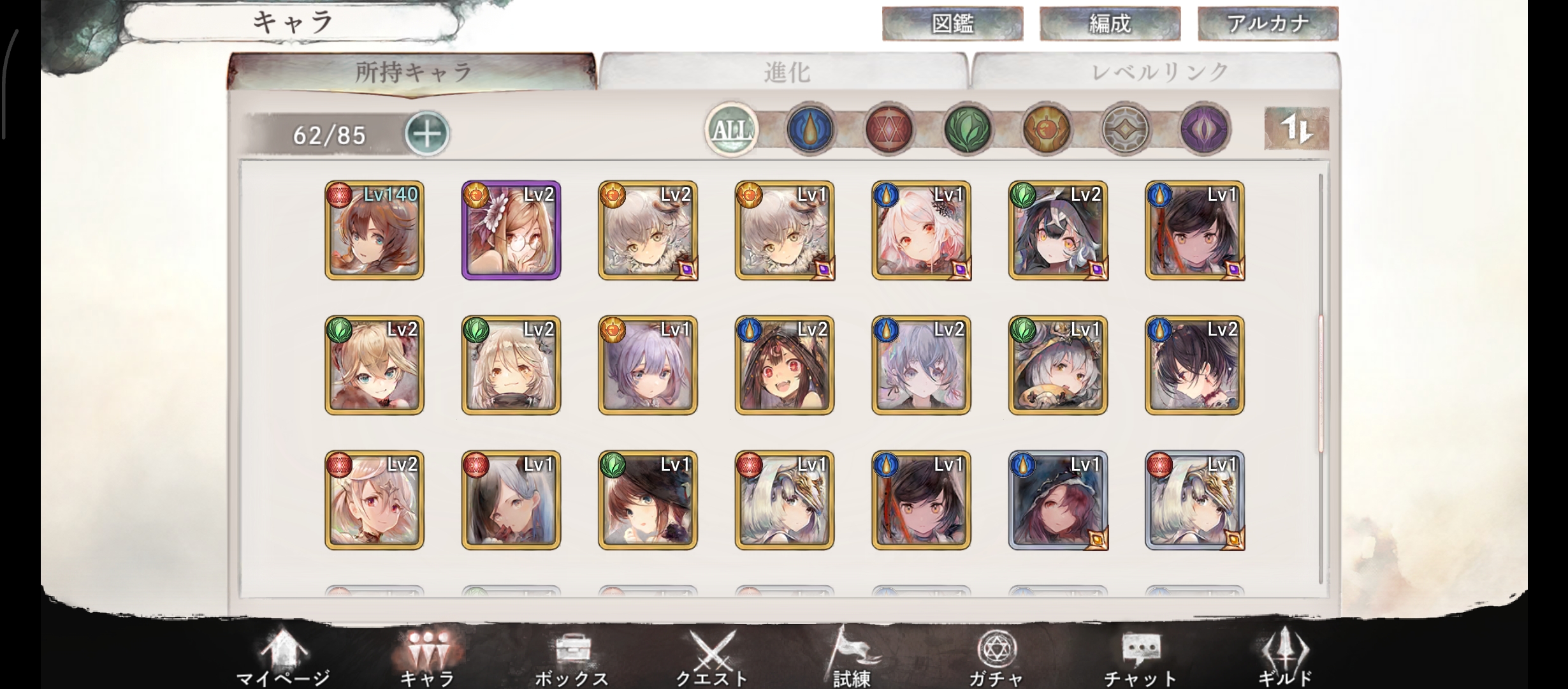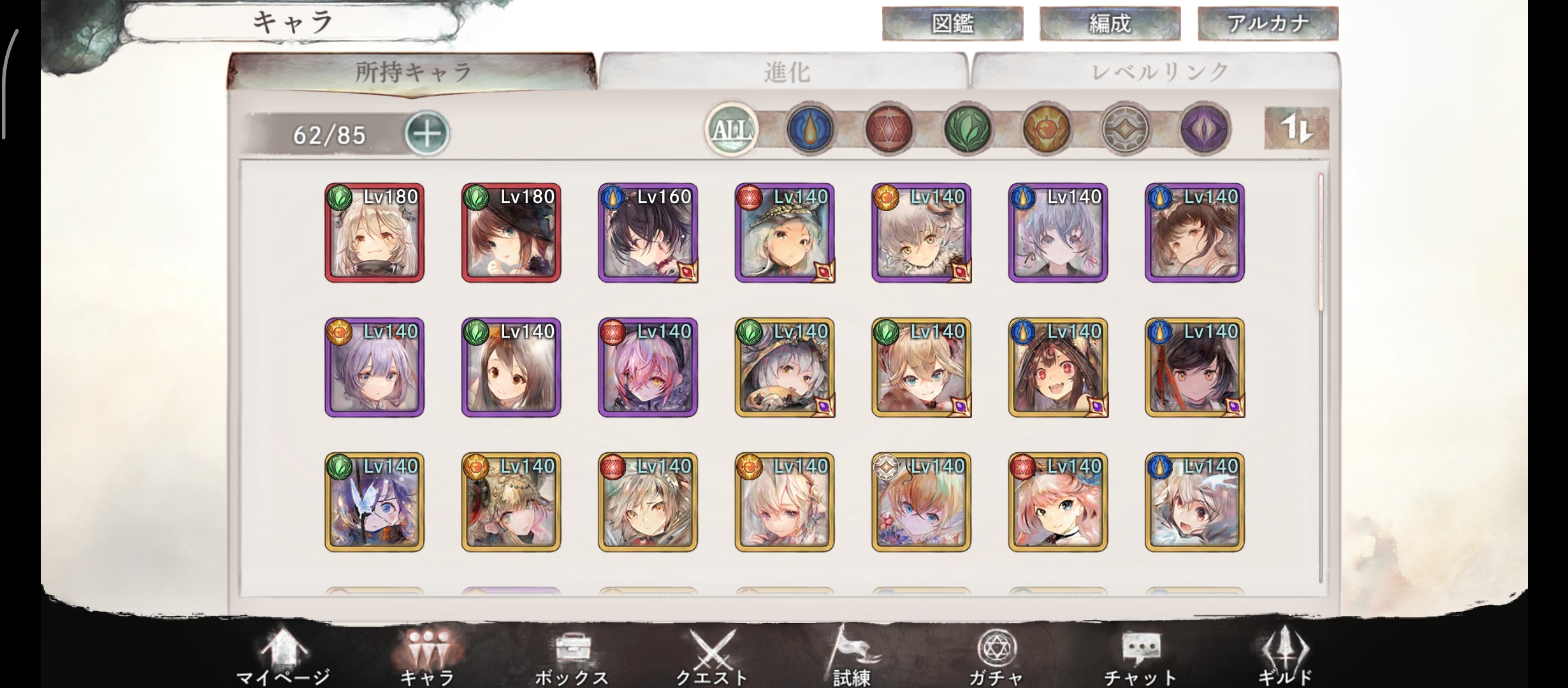 ・メインアタッカーレベル180、その他の四体をレベル160を目指すと良いと思う。レベルリンクでレベルが連動するので、属性は関係なく高レアに進化できたキャラを160に育てる。もちろん使用するキャラを進化させられたらそれがいいが、ガチャ運が絡むのでメインアタッカー以外で狙ったキャラを進化させるのは難しい。キャラを指名できるアイテムはよく考えて使う。